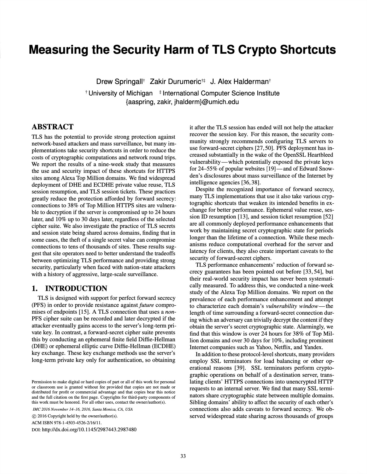 Drew Springall, Zakir Durumeric, and J. Alex Halderman. 2016. Measuring the Security Harm of TLS Crypto Shortcuts. In Proceedings of the 2016 Internet Measurement Conference (IMC '16), Association for Computing Machinery, Santa Monica, California, USA, 33-47. https://doi.org/10.1145/2987443.2987480
